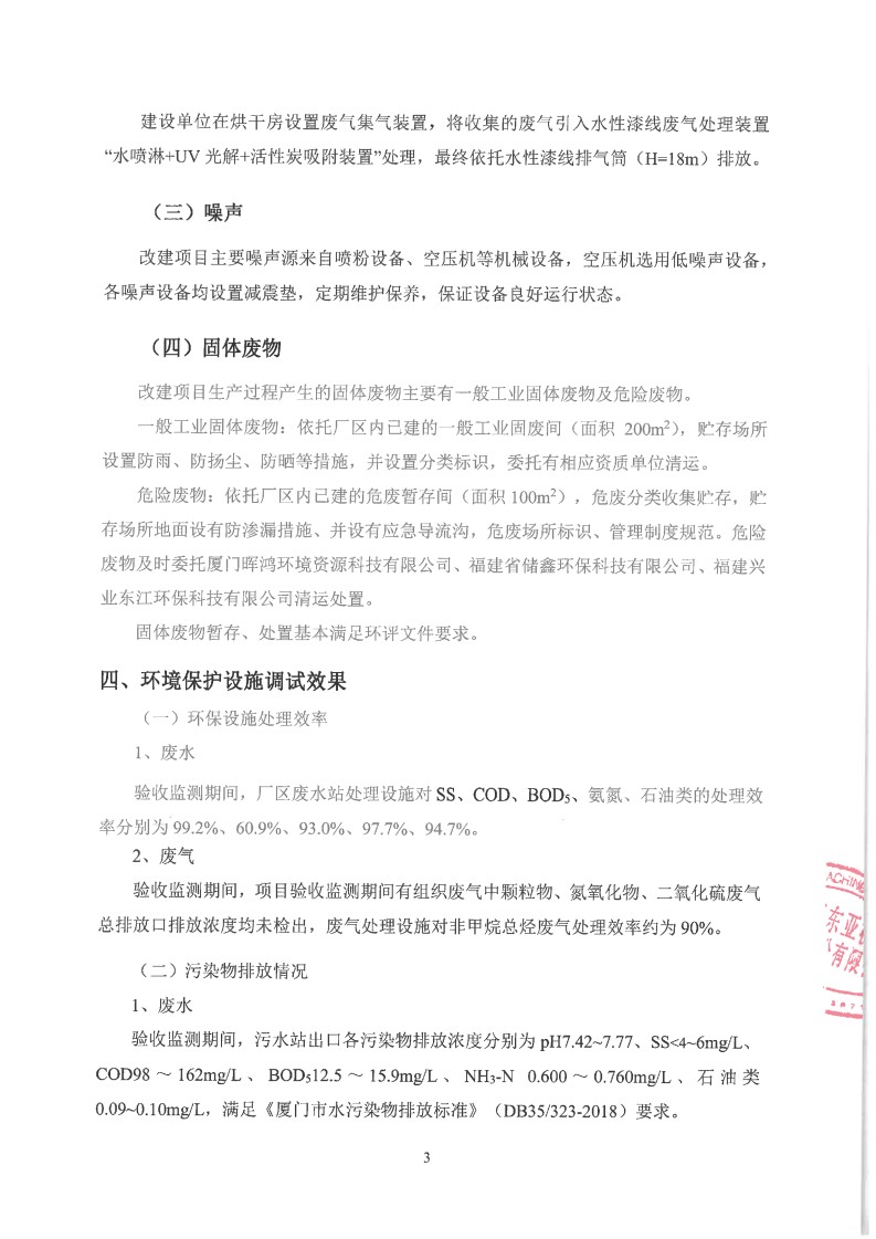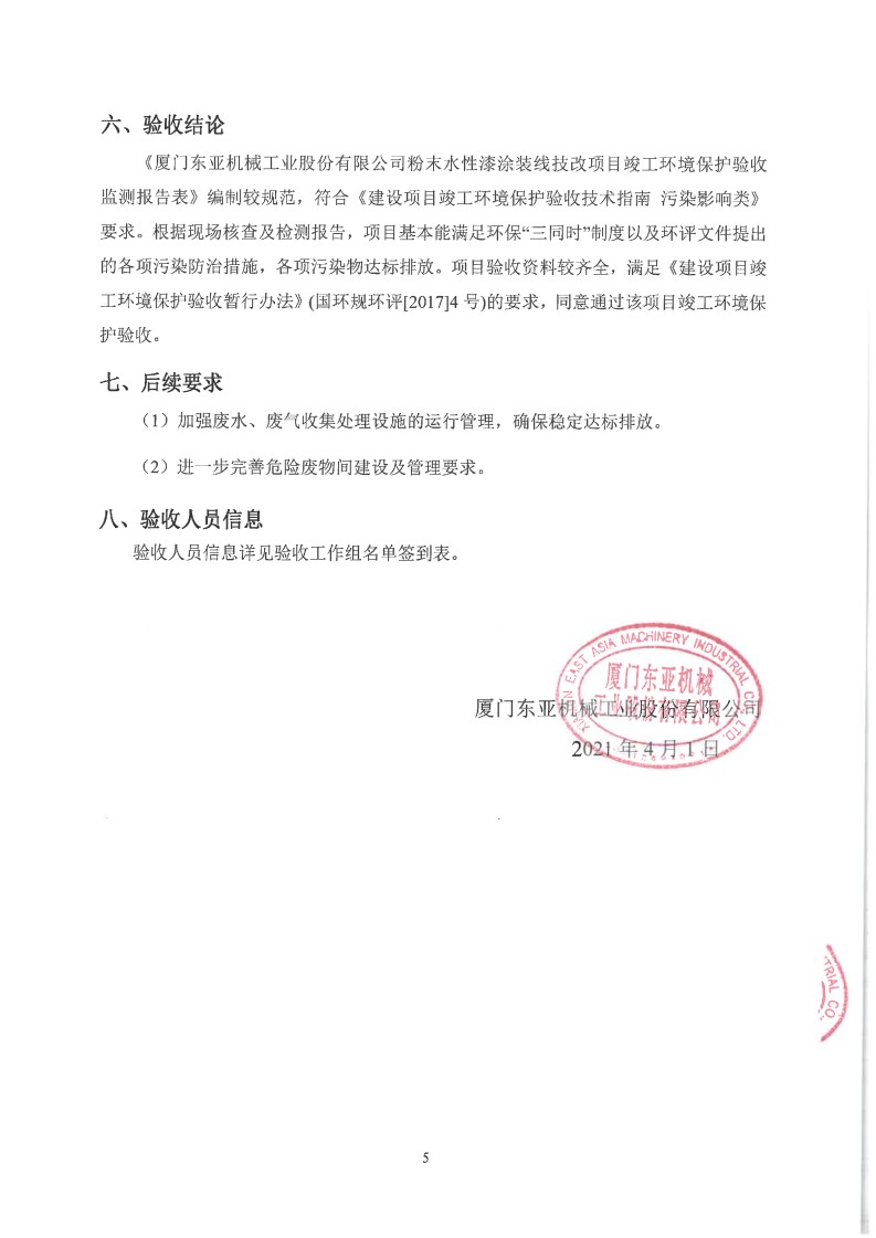 厦门东亚机械工业股份有限公司粉末水性涂装线技术改造项目(喷粉线部分)竣工环境验收意见