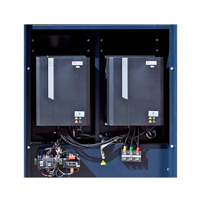 双变频器智能控制采⽤全新的变频器, 独创的控制算法使得两个变频器间互相协调, 有序且稳定地控制空压机,为您提供持续稳定的压缩空⽓。